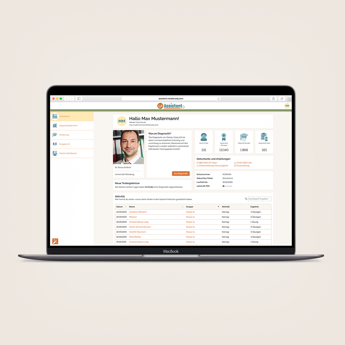 Der digitale Assistent von Meister Cody ist das zentrale Dashboard für deinen Schulalltag. Er zeigt Lernstände und Fortschritte deiner Schüler:innen auf einen Blick, erleichtert die Verwaltung von Klassen und Profilen und unterstützt dich zuverlässig bei Elterngesprächen sowie in der pädagogischen Planung.